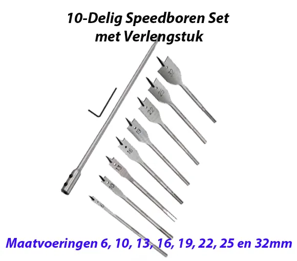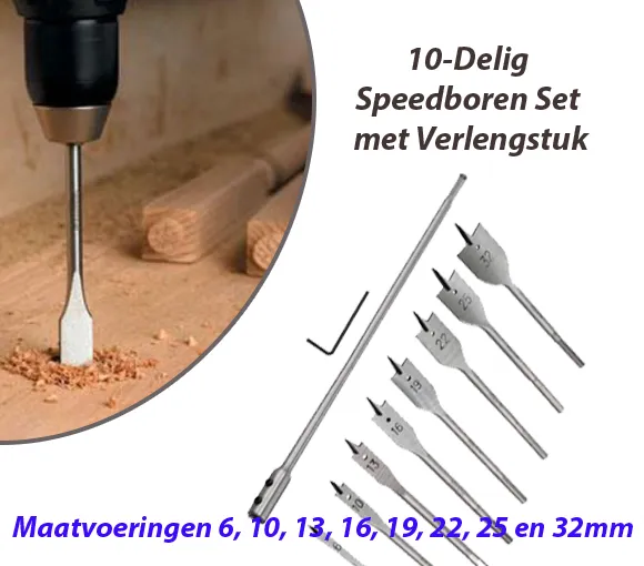 Speedboren zijn boren die gebruikt worden in alle soorten hout, het grote voordeel van deze speedboren is dat hij zich snel door het hout laat boren, dit komt doordat deze boren drie snijpunten heeft. Met een speedboor kunt u met hoge snelheid gaten boren in (dikker) zachthout. Voor speedboren zijn verlengstukken verkrijgbaar, zodat u nog dieper kunt boren