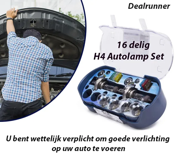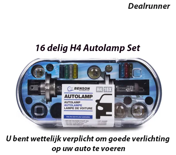 H4 Lampset, 16 delig, Lampenset, H4 lamp, Lampenset H4, Reservelampen. Met deze lampset zorgt u ervoor dat overige deelnemers aan het verkeer u op tijd kunnen opmerken. U bent wettelijk verplicht om goede verlichting op uw auto te voeren. Onthoud wel dat het stadslicht altijd mee brandt als het licht van de auto aangezet wordt. Als u alleen het dimlicht vervangt, blijft er dus altijd een gele gloed in de lamp aanwezig. Als u het stadslicht ook vervangt heeft u dus een mooi geheel. Is een van de lampjes aan vervanging toe? Vervang dan zelf de kapotte autolamp