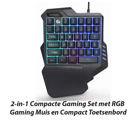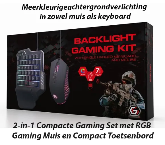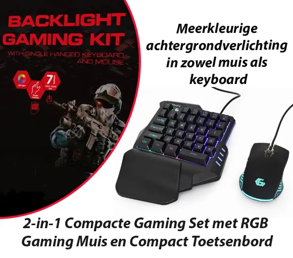 2-in-1 compacte gaming set met RGB Gaming Muis en Compact toetsenbord. Compact gaming toetsenbord voor gebruik met 1 hand. 2-in-1 gaming kit: compact gaming toetsenbord en gaming mouse met hoge resolutie. Compact (35 toetsen) toetsenbord voor enkelhandig gebruik met praktische multimedia sneltoetsen. 7-knops optische gaming muis (resolutie 1000 – 1600 – 3200 CPI). RGB LED Meerkleurige achtergrondverlichting in zowel muis als keyboard