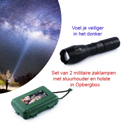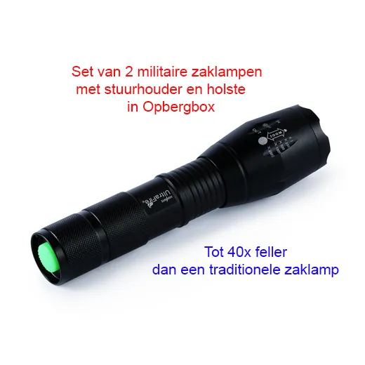 Bent u op zoek naar een extreem felle zaklamp, die u ook nog eens kan beschermen? Dan hebben we hier de ideale deal voor u! Namelijk de Militaire Zaklamp in de aanbieding