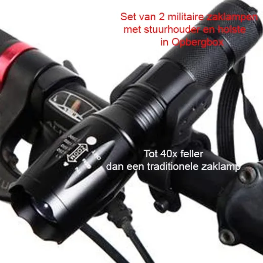krijg niet één maar zelfs twee militaire zaklampen! Bevestig de zaklamp op het stuur van je fiets. Zo kun je veilig jouw pad volgen.