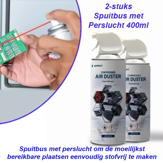 Deze apparaten kunnen allemaal niet zomaar gewassen worden waardoor perslucht een ideale oplossing is. Met een korte luchtstoot wordt stof en vuil verwijderd van het gekozen oppervlakte. Wat denk je van het oplaadpoortje op je smartphone? Hoe vaak zit daar geen stof in wat er niet uit wil, met deze perslucht blaas je hem zo schoon! Ook ideaal voor die vervelende hoekjes in jouw auto, in de keuken en zo zijn er nog wel 100 andere plekken te bedenken waar het ideaal is om perslucht te gebruiken.