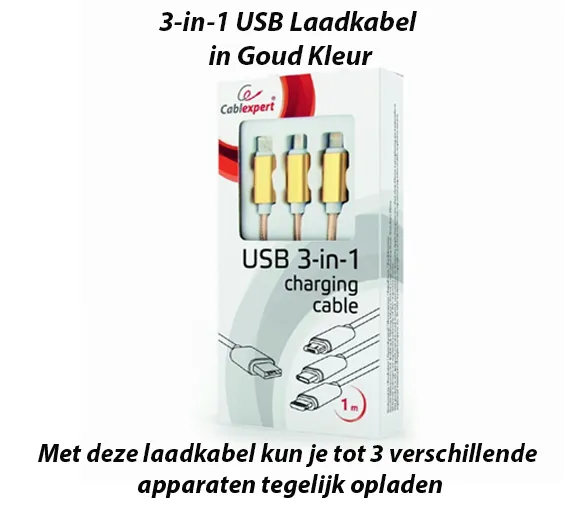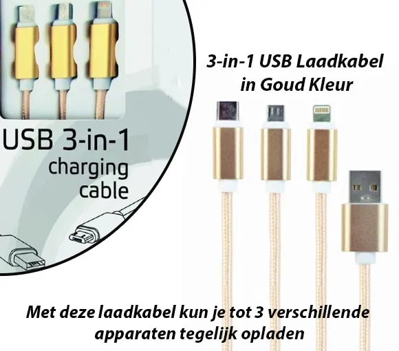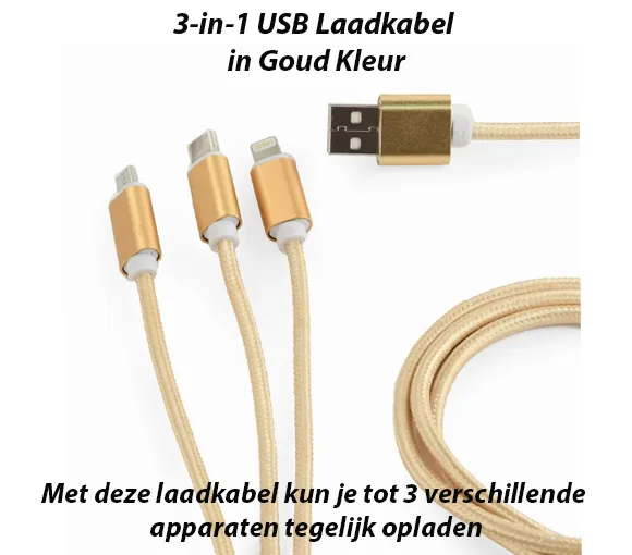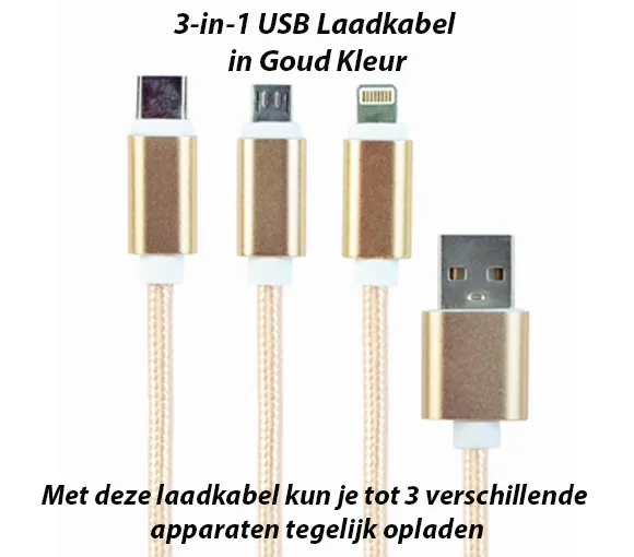 Met deze laadkabel kun je tot 3 verschillende apparaten tegelijk opladen. Hij is geschikt voor het laden van zowel iPhones, als micro-USB en USB type-C smartphones.USB laadkabel met 8-pin, USB-C en Micro USB connectors. Geschikt voor het laden (geen data) van maximaal 3 smartphones tegelijkertijd. Duurzame metalen connectoren en met katoen omhulde kabel