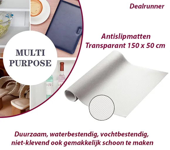 Deze mooie antislipmat zorgt voor meer grip op de ondergrond waardoor de kans op uitglijden of het verschuiven van spullen fors minder wordt. Deze universele antislipmat kan worden gebruikt in de keuken, badkamer, caravan, woonkamer en nog veel meer plekken. Hij heeft een afmeting van 150 x 50 cm. Ideaal voor keukenladen, kast / garderobe planken, werktafel, etc. Ruwe bovenzijde voor betere grip en superieure antislip laag aan de onderkant. Voor gebruik in keukenladen en -planken – beschermt meubels tegen waterdruppels en de antislipfunctie houdt het bestek en het keukengerei op hun plaats.