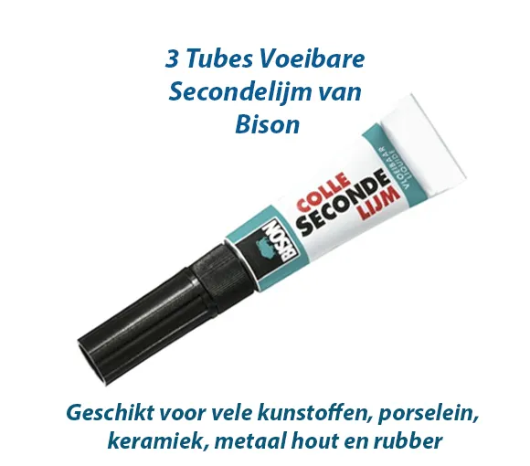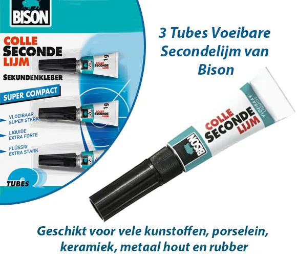 De Bison secondelijm is een super sterke, razendsnelle universele secondelijm in een ultra moderne dispenser. Deze sterke seconde lijm van Bison lijmt verschillende materialen zoals kunststoffen, metaal, rubber hout en porselein. De verpakking bevat 3 tubes van 1 gram. Elke tube bevat de ideale hoeveelheid voor 1 reparatie. Hierdoor is de lijm gemakkelijk en schoon te gebruiken