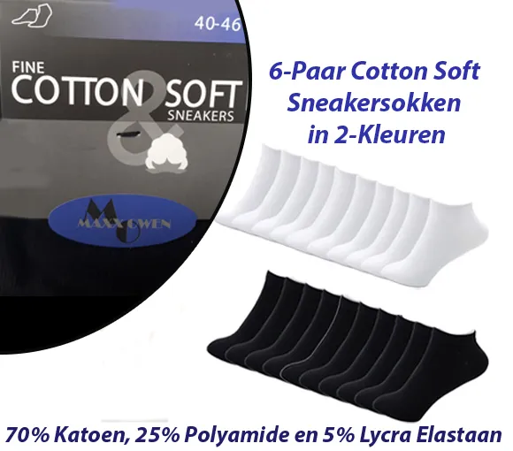 Deze heerlijke 6-Paar Cotton Soft Sneakersokken in 2-Kleuren zijn zonder voelbare naad. Anti transpiratie door hoog katoen gehalte. Krimpvrij. Zonder naad op de tenen. Materiaal 70% katoen, 25% polyamide, en 5% lycra elastaan. 40 graden wasbaar. Kleuren zwart en wit