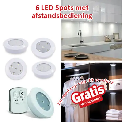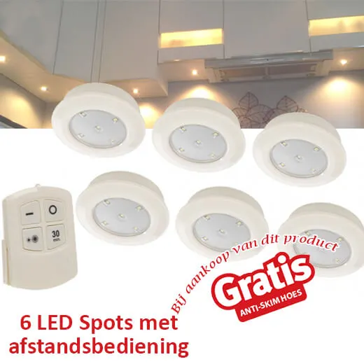 Dit zijn namelijk geen gewone LED-spots, maar draadloze LED-spots! Een super strak en plat design. Eenmaal geplaatst bedien je de spots gemakkelijk met de meegeleverde afstandbediening of natuurlijk gewoon door een keer op de spot zelf te drukken. Je kunt met de afstandbediening kiezen of je een fel of sfeerlicht nodig hebt. Maar ook kan er een timer worden ingesteld, zodat de spots na 30 minuten automatisch uit gaan. Daarnaast krijg je een houder voor de afstandbediening erbij, die je gemakkelijk aan de muur bevestigt. Zo hoef je niet langer te zoeken waar je hem ook weer hebt laten liggen.