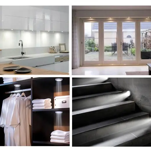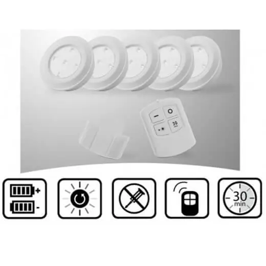 De draadloze LED-Spots werken op 3 AAA-batterijen (niet inbegrepen) en zijn hierdoor gemakkelijk overal te monteren. In elke spot zitten 5 energiezuinige, maar sterke LED’s (10.000-12.000 MCD). Hierdoor heb je wel een helder wit licht, maar hoef je niet elke week de batterijen te vervangen.
