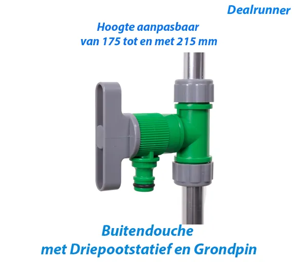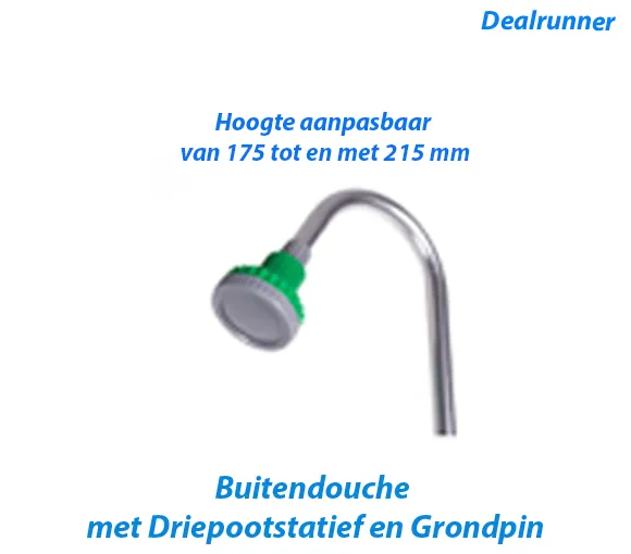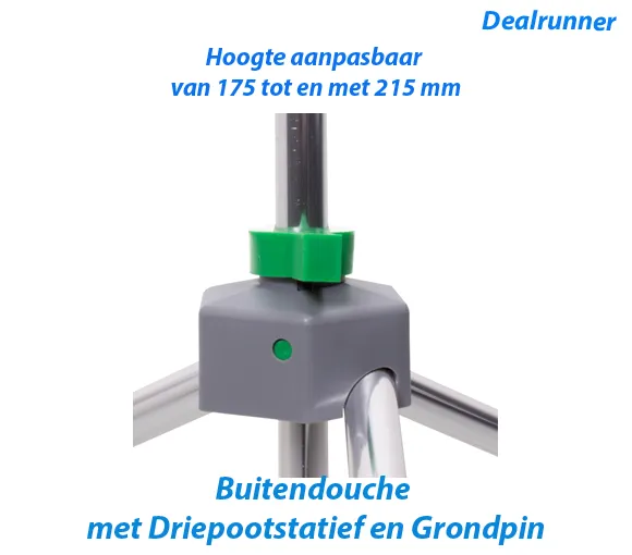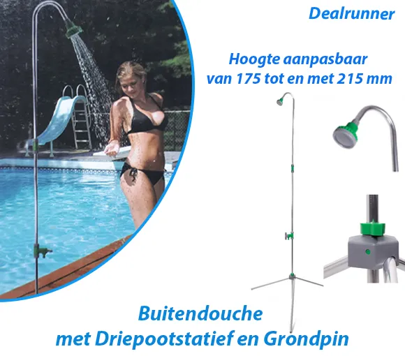 Deze buitendouche is speciaal bedoeld voor als je na het zwemmen in de tuin je jezelf even wilt afspoelen. De buitendouche is gemakkelijk overal in de tuin of op het terras te plaatsen dankzij de driepootstatief en de grondpin. De buitendouche is in hoogte aanpasbaar van 175 tot en met 215 mm