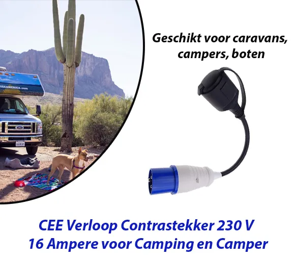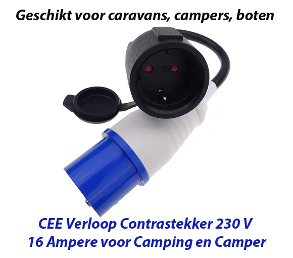 CEE-stekker op geaarde koppeling. Aarding contactkoppeling met deksel. Kabellengte campingadapter 20 cm. CEE-adapterstekker 3-polig. CEE-stekker en Schuko-koppeling geschikt voor 230 V 16 A . Spatwaterdicht, ook geschikt voor buiten. Adapter CEE 16A op Schuko ook geschikt voor boot, markt, campinguitstapje met camper of werkplaats, bouwplaats