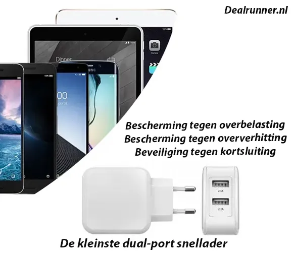 De kleinste dual port snellader. Dit is een dual-Port USB Charger en kan twee mobiele apparaten tegelijk opladen. Het is uitermate geschikt voor de iPhone, iPad, Android en andere apparaten die kunnen worden opgeladen via de USB-aansluiting.