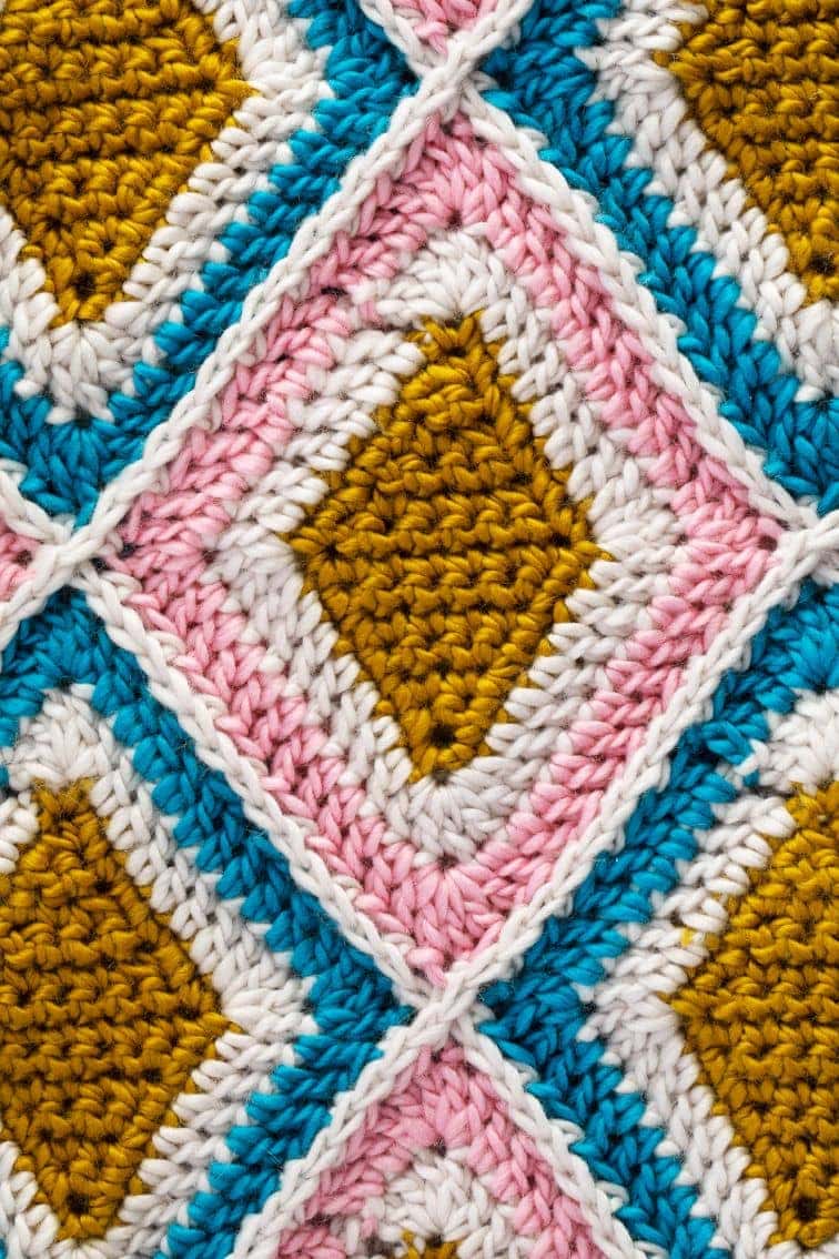 In de winter is niets zo fijn als gezellig op de bank zitten, kopje koffie of thee erbij, muziek aan en dan ‘diamonds’ ofwel ruitjes haken voor deze heerlijk warme deken.