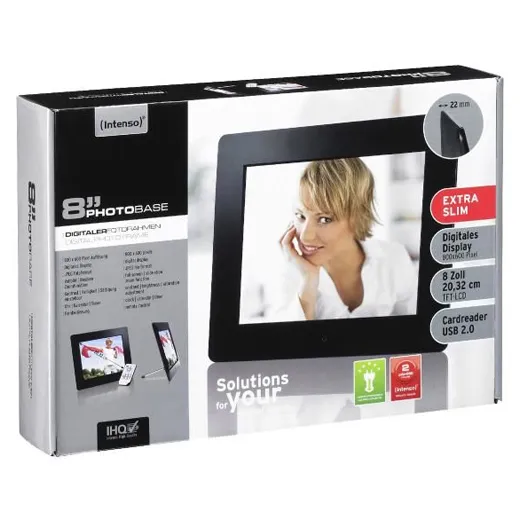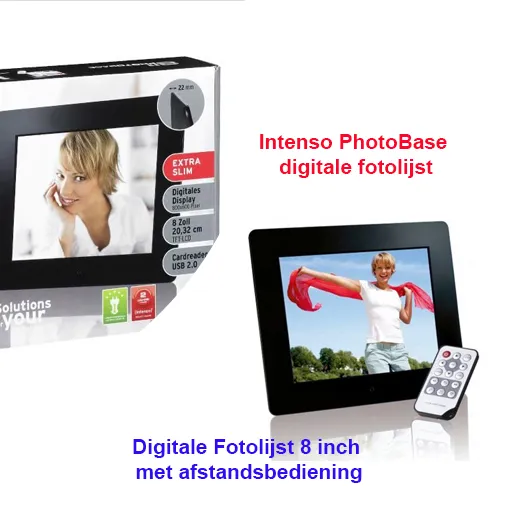 Intenso Digitale Fotolijst met 8 inch Slim Base. Met de Intenso Digitale Fotolijst met 8 inch Slim Base kunt u al uw favoriete digitale foto’s weergeven. Zo hoeft u niet te kiezen welke foto u laat inlijsten. Vanaf een geheugenkaart of USB stick kunt u makkelijk een diashow instellen. Met de bijgeleverde afstandbediening kunt u uw voorkeuren aanpassen, foto’s overslaan of juist terug gaan naar een speciale foto. Deze digitale fotolijst is van het formaat 8 inch en is geschikt voor JPEG foto’s