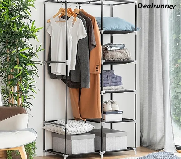 Een complete en veelzijdige organizer voor kleding en schoenen. Ideaal om alle gewenste locaties te gebruiken als extra draagbare kast (thuis, op de camping, op reis, enzovoort). Deze stoffen kast met plastic en stalen structuur kan uit elkaar worden gehaald. Beschermt de kledingstukken tegen stof of vuil van buitenaf. De kast beschikt over een roldeur, een stang om kleerhangers aan op te hangen en schappen om kleren, schoenen, accessoires en dergelijke op te bergen. Eenvoudig schoon te maken met een vochtige doek.
