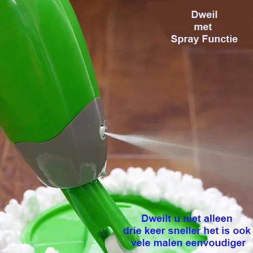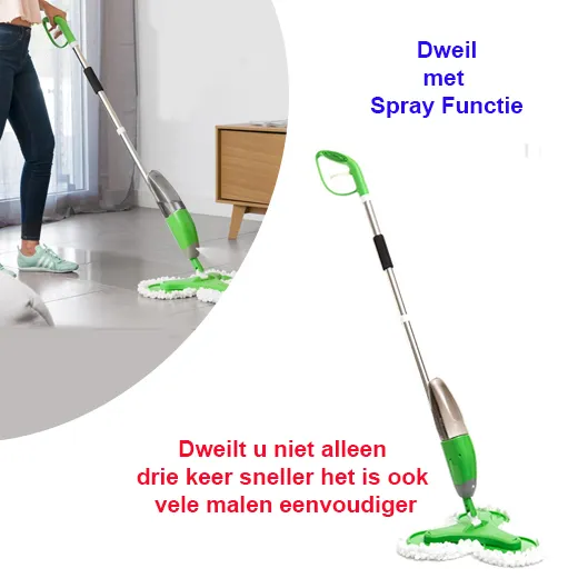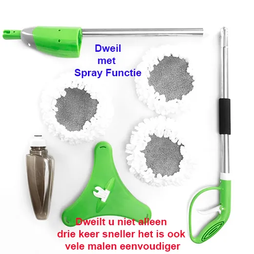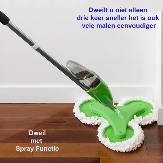 Een praktische dweil met drie hoofden en een effectieve vloeistof dispenser voor schoonmaakmiddel om vloeren en andere oppervlakten gemakkelijk schoon te maken. Bereik de kleinste hoekjes en bereik een optimaal resultaat. Met de Triple Spray-Mop Dweilt u niet alleen drie keer sneller het is ook vele malen eenvoudiger. U vult de dispenser met water en zeep naar keuze. Hierna plaats u de Velcro Microvezeldoeken om de drie moppen. Spray een paar keer door de hendel in te knijpen en er zal een precieze hoeveelheid water op de vloer komen