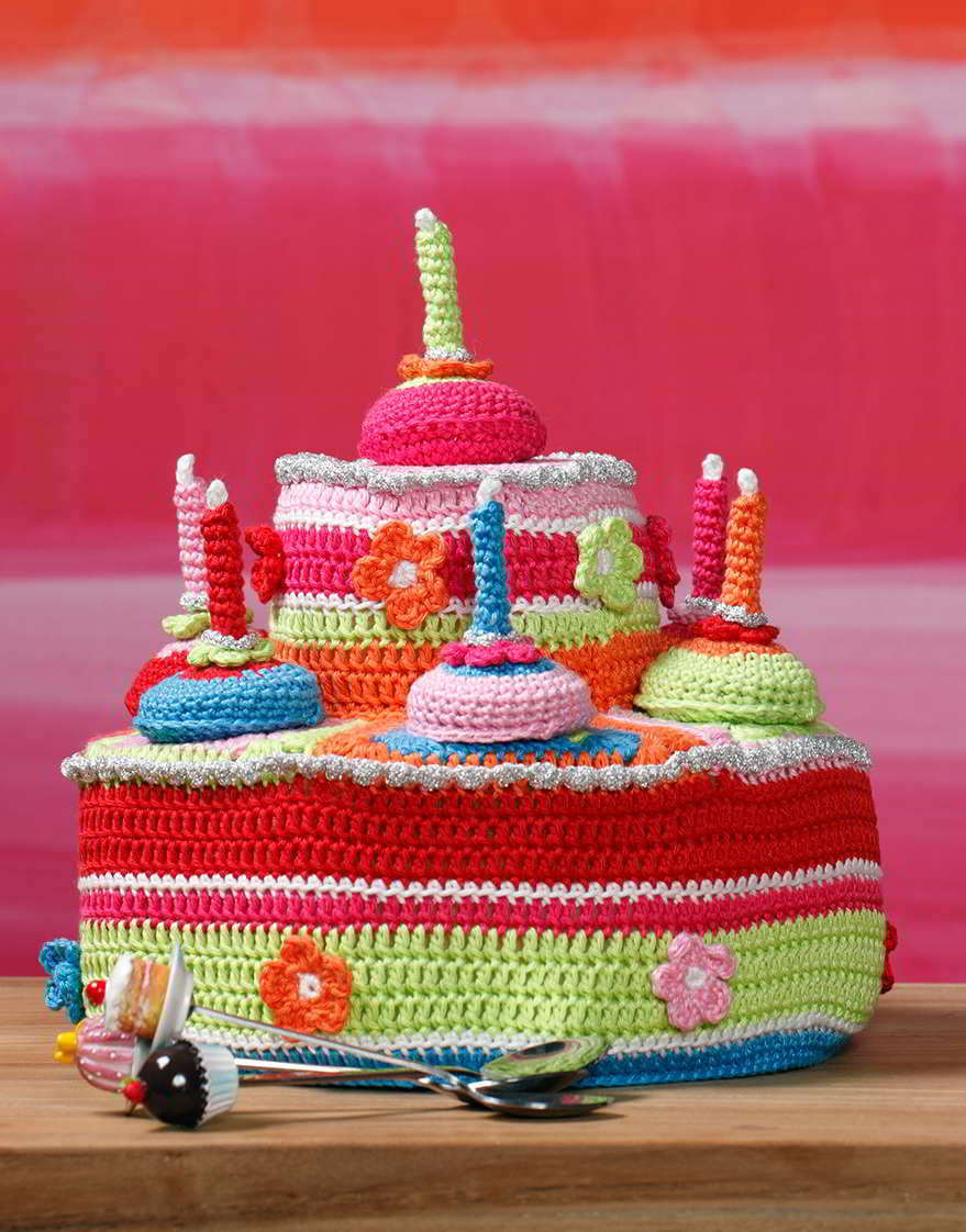Bij een feest hoort een taart en deze gehaakte taart – compleet met kaarsjes – maakt ieder feest compleet. De potjes geef je als traktatie.
