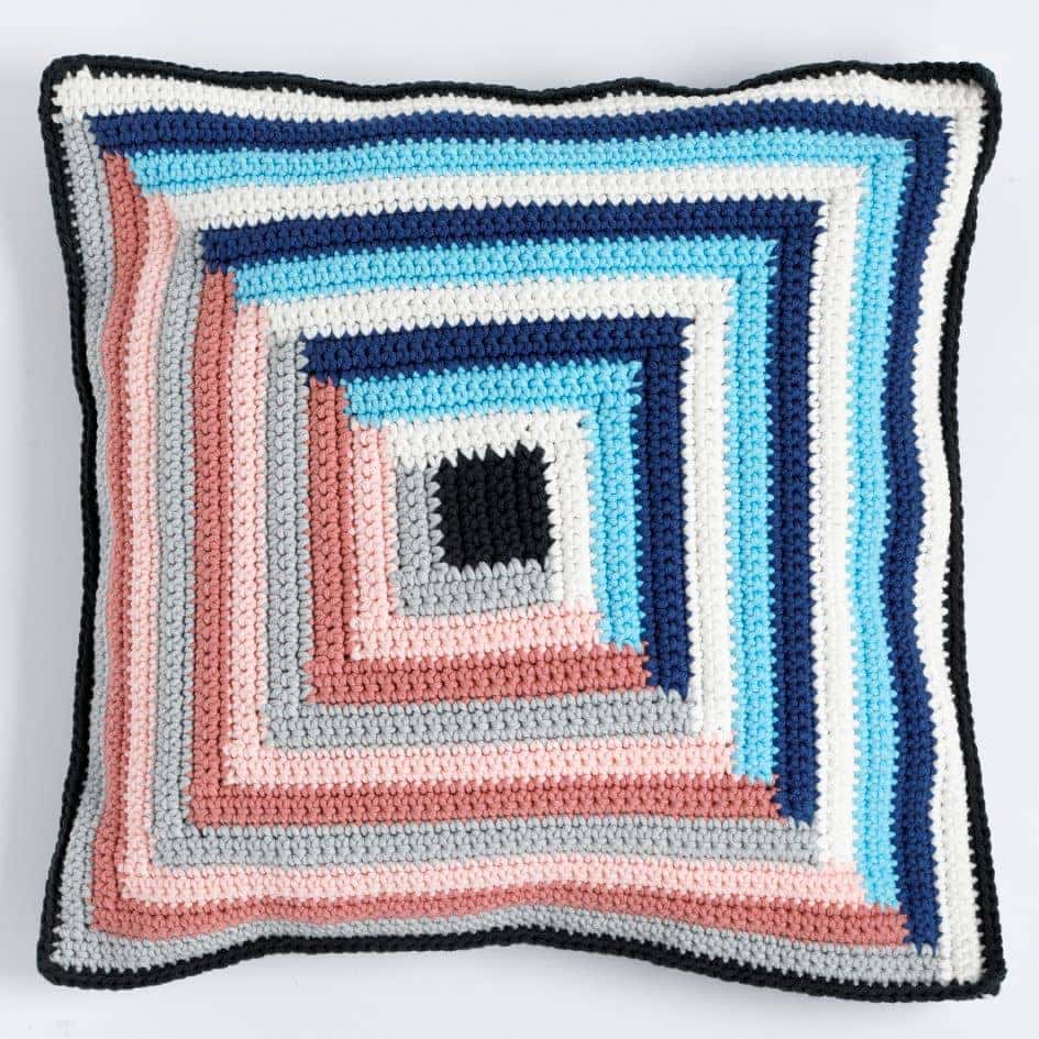 Log cabins worden al eeuwenlang gebouwd van houten balken die op de hoeken uitsteken en over elkaar heen liggen. De manier waarop dit kussen is gemaakt lijkt er veel op, het is alleen heel wat kleurrijker dan zo’n houten huis!