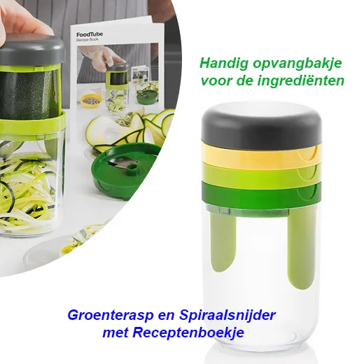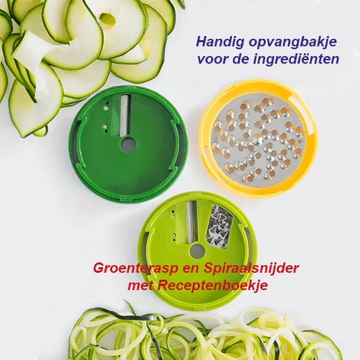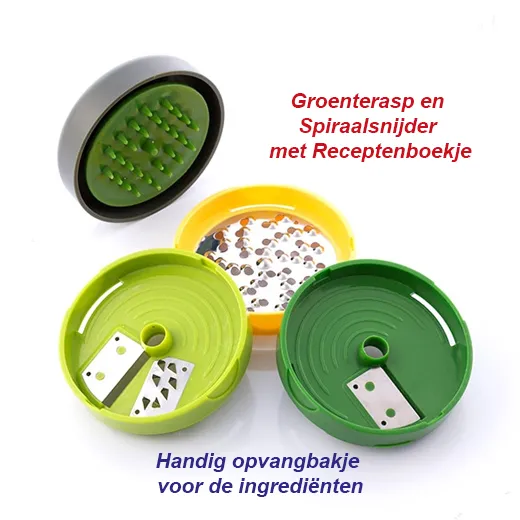 De praktische en handige groenterasp en spiraalsnijder met receptenboekje. Hij is ideaal om fruit en groenten op verschillende manieren te snijden! Perfect voor originele en overheerlijke garnituur. Dankzij het kleine formaat kan je hem makkelijk overal opbergen.Samen met de spiraalsnijder worden er twee snijvormen geleverd waarmee u eenvoudig linten of julienne groentes als wortelen, courgette, komkommer, bieten en meer kunt snijden