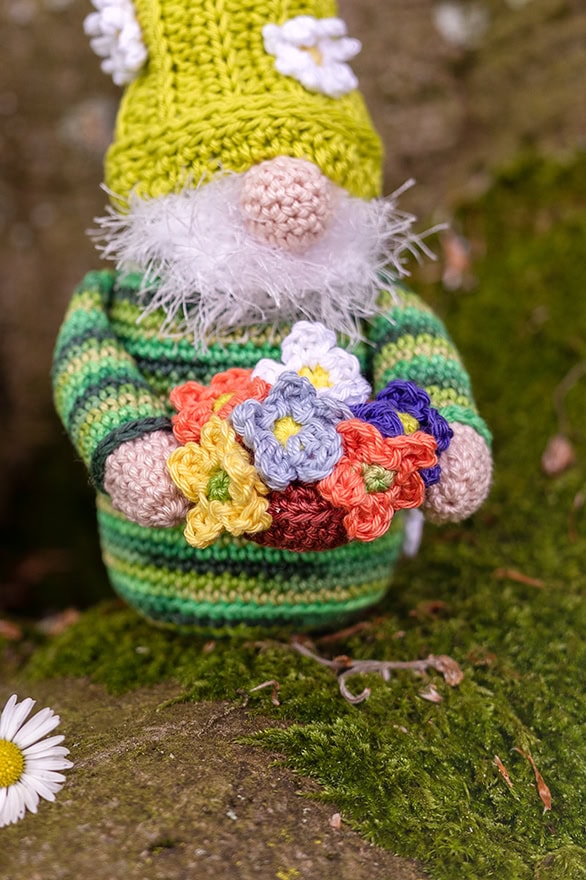 Een gnome met mooie bloemen, wie kan daar nu weerstand aan bieden? Geef dit gehaakte exemplaar van een bloementomte cadeau en maak een dierbare blij.