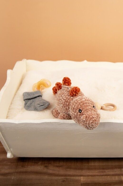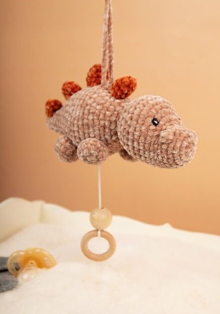 Superzachte muziekknuffel! Doris is een kleine dino en superzacht door het Velvet-garen. Als je aan het touwtje trekt, dan hoor je een schattig muziekje en daar zijn alle baby’s en kleine kinderen dol op. Leuk voor boven de wieg of box.