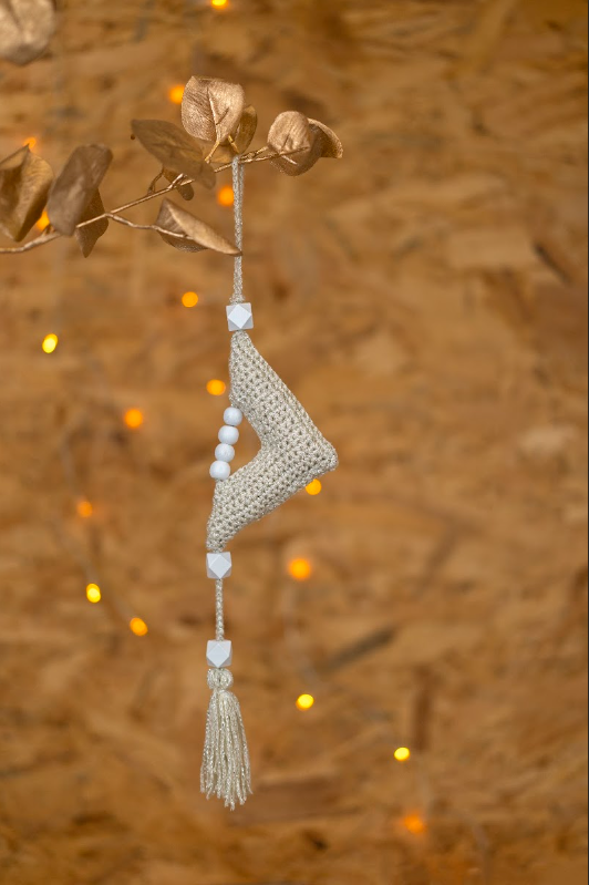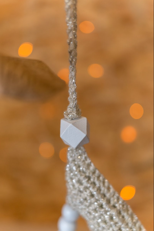 Deze hanger ziet er heel feestelijk uit door het garen vol glinsters. Hij is extra mooi als er kaarsjes of lichtjes branden dus de kerststemming komt dan vanzelf.