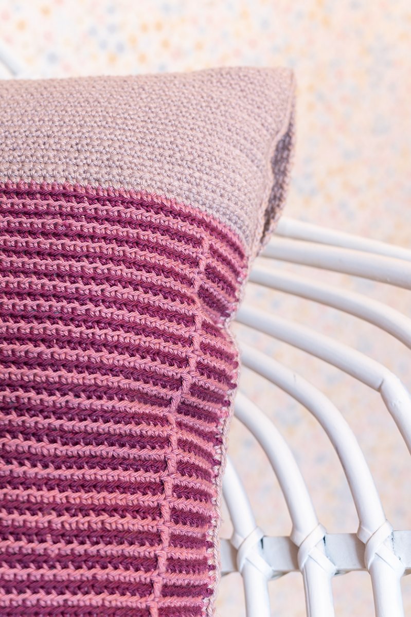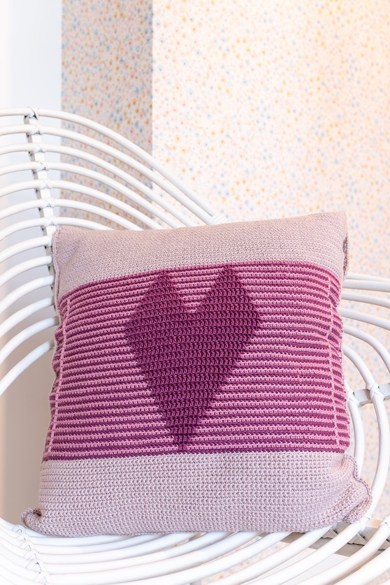 Een ‘hartveroverend’ kussen dat je overal neer kunt leggen: binnen op de bank of buiten in een stoel op het terras. Dit is een echt hebbeding met een vrolijk hart aan de voorkant en stoere knopen aan de achterzijde. Probeer ook eens deze leuke overlay haaktechniek!