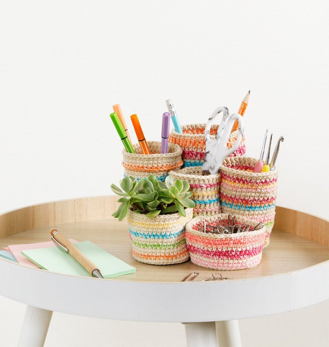 Geïnspireerd op een vintage pennenstandaard van plastic ontstond het idee voor dit perfecte alternatief, gehaakt van garen, met vrolijke strepen. Maak hem in je favoriete kleuren. Natuurlijk kun je naast pennen ook je favoriete haaknaalden erin bewaren!