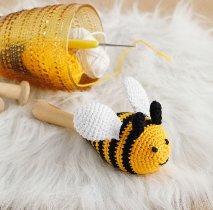 Lekker ritmisch rammelen met een sambabal: daar word je blij van! Nog leuker is het als hij ‘verkleed’ is als een bij want zo zorgt het ‘instrumentje’ voor dubbel zoveel plezier.