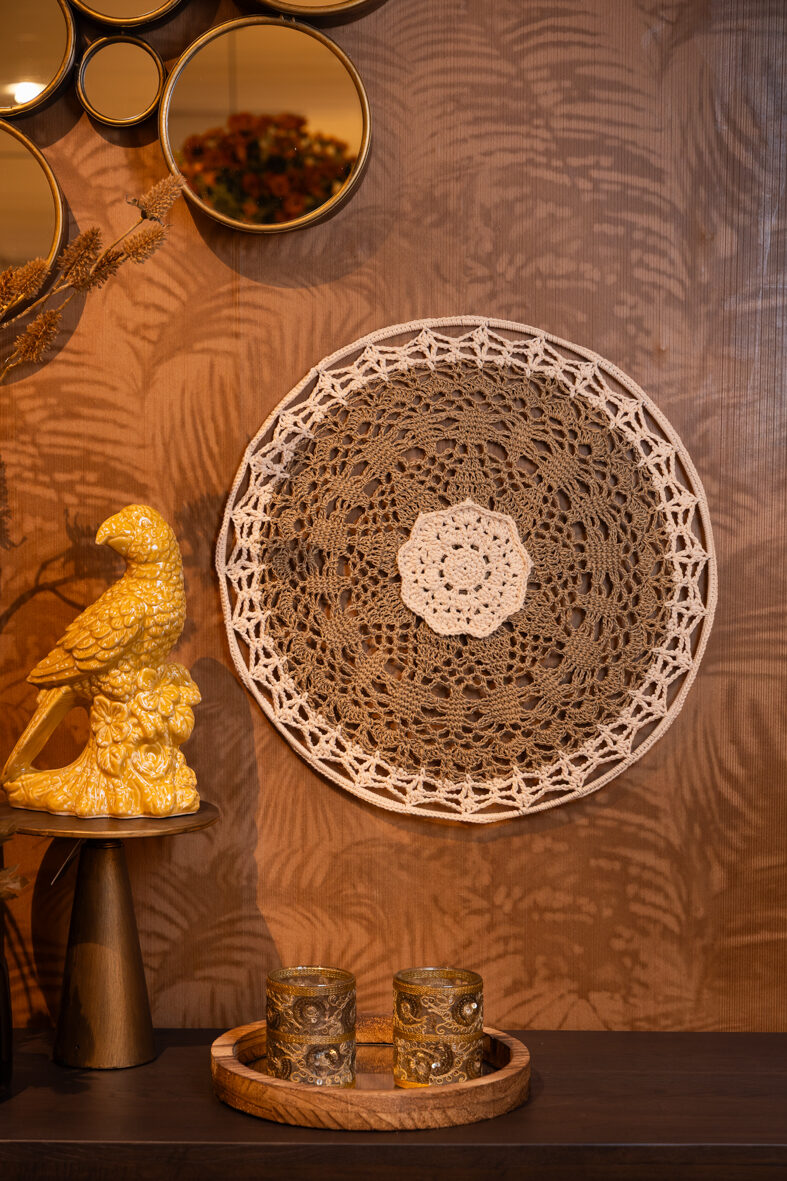 Een mandala is een tijdloze decoratie en deze heeft net dat beetje extra, want je maakt hem van touw en garen. Door deze materialen in twee tinten krijgt hij een mooie, eigentijdse, robuuste uitstraling. Dit project wordt met haaknaald 3 en 4 gehaakt.