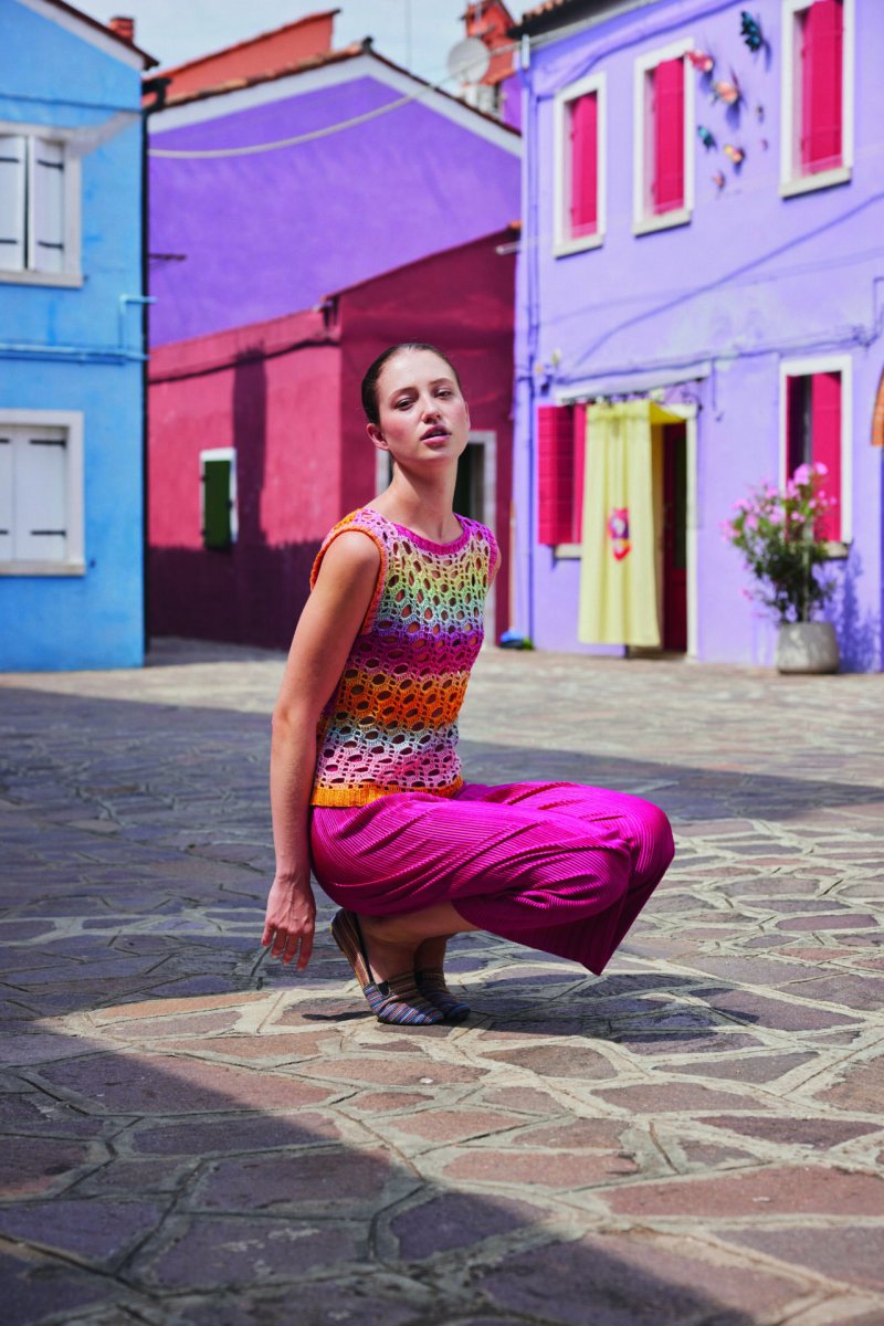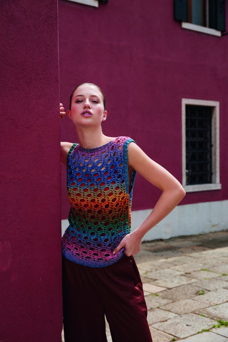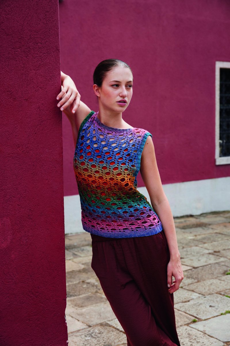 Kun je naast haken ook breien? Dan is dit de perfecte top voor jou als je van haken en breien houdt! Deze tijdloze top trekt meteen de aandacht door het levendige kleurverloop en de verfijnde opengewerkte structuur. Het patroon van geometrische uitsneden creëert een luchtig effect, perfect voor de warme dagen.