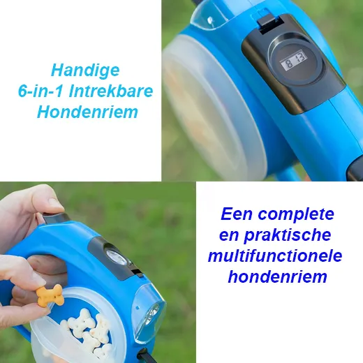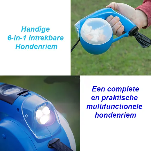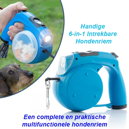 De handige 6 in 1 intrekbare hondenriem is perfect voor honden bezitters die graag al het nodige bij de hand hebben voor heerlijke wandeltochten met de honden, zowel ’s nachts als overdag.