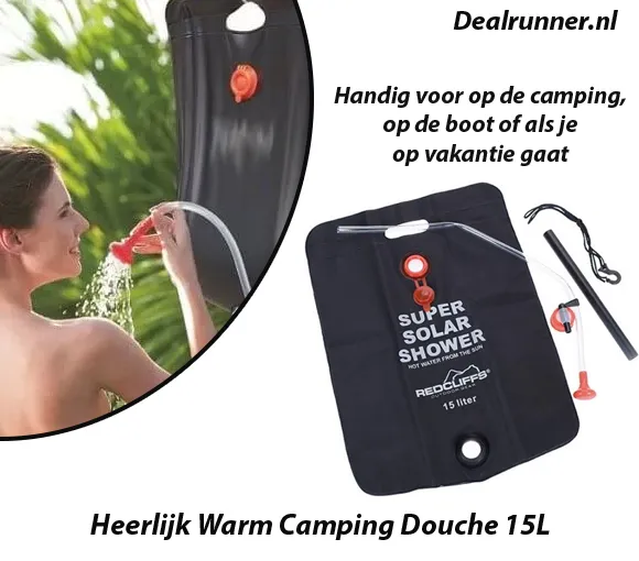Heb je plannen om binnenkort weer te gaan kamperen? Dan kan je nu douchen waar je maar wilt dankzij de makkelijke en handige 15 Liter camping douchezak. De Camping Shower maakt gebruik van de warmte van de zon om het water warm te maken. Hij is gemaakt van een efficiente 4-laags constructie om de warmte optimaal te benutten. Hij heeft een gemakkelijk te gebruiken vulgat en een afhaalbare douchekop. De douchekop kunt u gemakkelijk aan en uit zetten aan de hand van de draaiknop. Er kan 15 liter water in en dit is ruim genoeg voor 1 persoon om goed te douchen