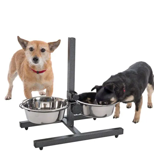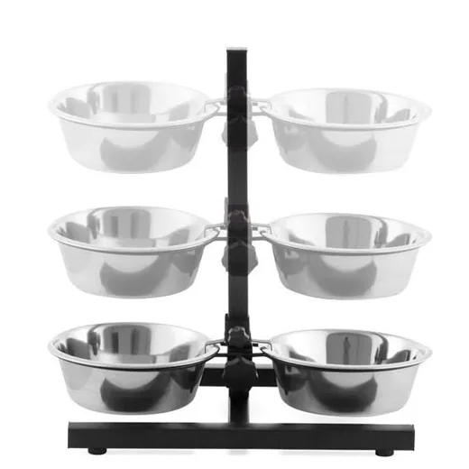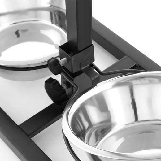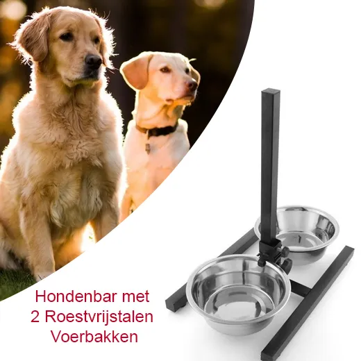 De hondenbar met roestvrijstalen voerbakken maakt het eten voor alle grote en oude honden makkelijker. De houder van de dubbele voerbak kan traploos in de gewenste hoogte worden ingesteld. Zo kan uw hond in een comfortabele houding in de voor hem optimaal ingestelde hoogte ontspannen eten en drinken, zonder zich te ver naar voren te moeten buigen. Daardoor voorkomt de hondenbar bij uw hond pijnlijke verrekkingen bij het eten en ontziet de gewrichten van de voorpoten en zijn tussenwervels.