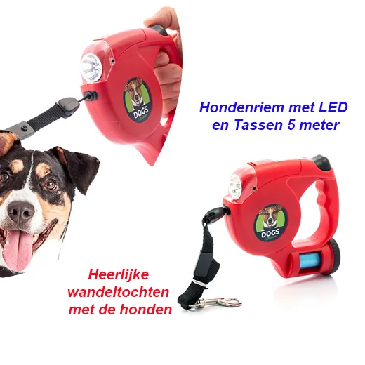 De handige intrekbare hondenriem met LED en Tassen 5 meter is perfect voor honden bezitters die graag al het nodige bij de hand hebben voor heerlijke wandeltochten met de honden, zowel ’s nachts als overdag.