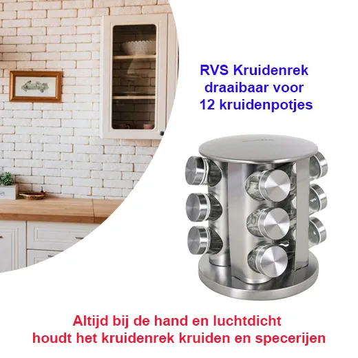 Kruidenrek RVS draaibaar voor 12 kruidenpotjes. Altijd bij de hand en luchtdicht, houdt het kruidenrek kruiden en specerijen. Het kruidenrek zorgt voor een opgeruimd en rustige keuken. Alle rondslingerende potjes zijn nu bij elkaar gebundeld in een stijlvol overzicht. In één oogopslag weet je precies welke kruiden je tot je beschikking hebt. Met 12 kruidenstrooiers, gemakkelijk in te doseren (zonder inhoud)