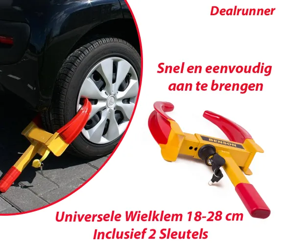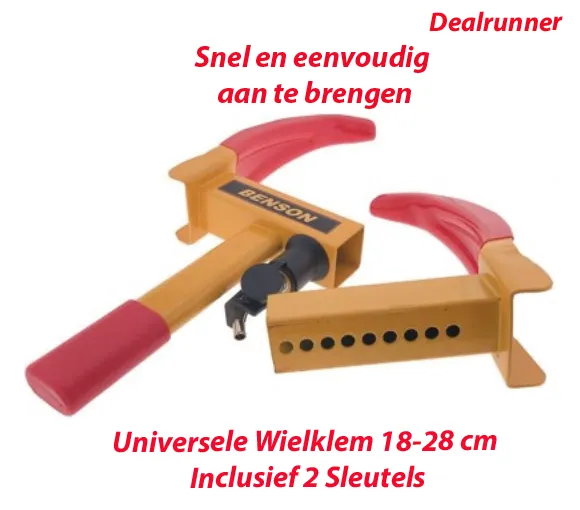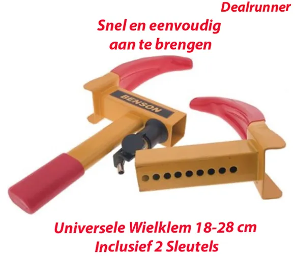 Benson wielklem, biedt uitkomst om de auto of ander voertuig, zoals een aanhanger of caravan tegen diefstal te beschermen. Het stevige slot past op wielen van 18-28 cm met een maximale wielbreedte van 265mm. Dankzij het slot dat aan uw band klemt, kan niemand uw auto of aanhanger wegrijden of -rollen. Zonder sleutel is het namelijk onmogelijk om het slot te verwijderen. Dit type wielklem past over het algemeen niet bij caravans., dit vanwege de beperkte ruimte in de wielkast