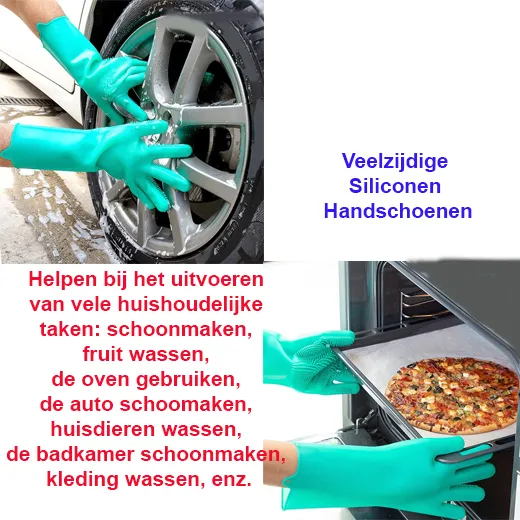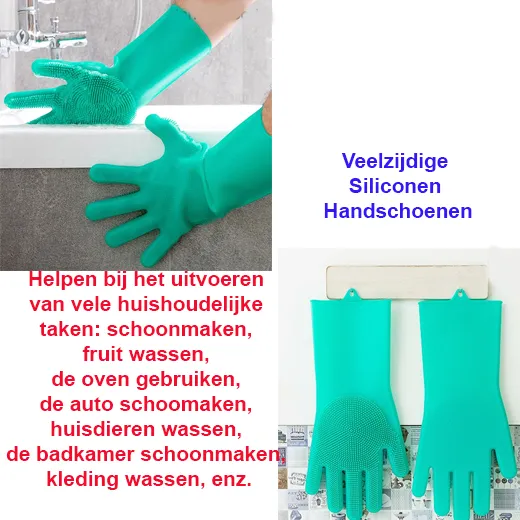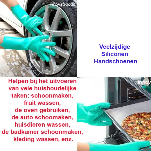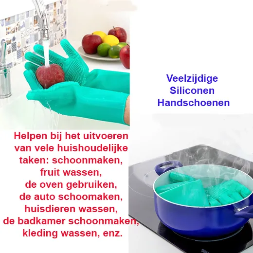 Een paar handschoenen dat zeer veelzijdig is en nuttig is in het huishouden, en helpen bij het uitvoeren van vele huishoudelijke taken: schoonmaken, fruit wassen, de oven gebruiken, de auto schoonaken, huisdieren wassen, de badkamer schoonmaken, kleding wassen, enz. Zeer stabiel en duurzaam. Hoge temperatuurbestendigheid: -40 °C tot +230 °C. Beschermt tegen hitte, kou en agressieve middelen. Geschikt voor de magnetron en vaatwasser. Gemakkelijk aan/uit te trekken. Geen aan elkaar plakken of scheuren zoals bij dunne spoelhandschoenen. Geoptimaliseerde noppenopstelling biedt in vergelijking met andere handschoenen hoge vingerbeweeglijkheid + veiligheid door extra anti-slip noppen tussen vingers en de gehele handpalm (belangrijk bijvoorbeeld bij het spoelen van glazen)
