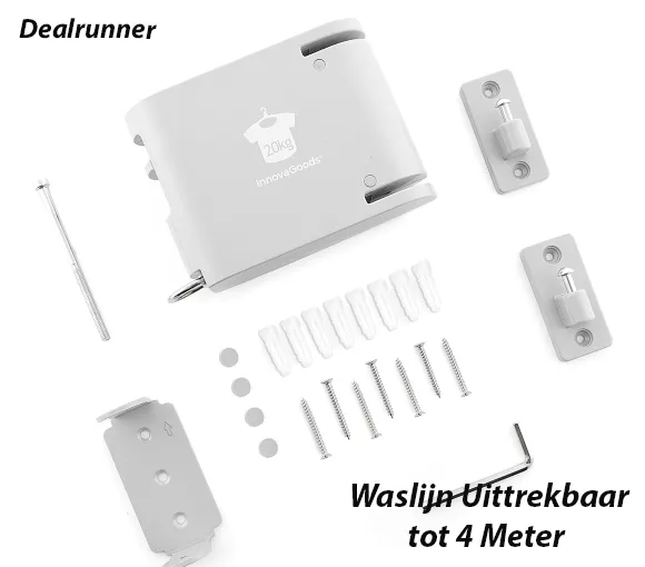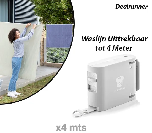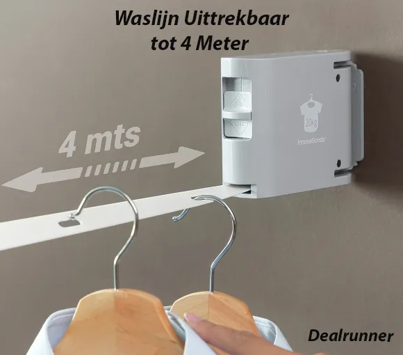 Een originele en veelzijdige uittrekbare waslijn dat zeer handig en praktisch is om kleding op de best mogelijke manier op te hangen. Het heeft een riem met gaten voor kleerhangers, die volledig kan worden aangepast aan de hoeveelheid kleding die wordt opgehangen en waarmee de kleerhangers stevig kunnen worden vastgehouden. De riem kan naar behoefte tot de gewenste lengte (max. 4 m) worden verlengd. Hij is voorzien van een vergrendeling, zodat de riem kan worden uitgetrokken en op de gewenste lengte kan worden vastgezet. Dankzij het compacte, lichte en intrekbare ontwerp neemt de waslijn zeer weinig ruimte in beslag wanneer hij niet wordt gebruikt, aangezien hij volledig is ingetrokken en discreet aan de muur bevestigd blijft, waardoor ruimte wordt bespaard en optimaal wordt benut. Dit type waslijn vergemakkelijkt het snel drogen en strijken, aangezien de kledingstukken niet opeengestapeld liggen en op de juiste afstand blijven om lucht te laten circuleren tussen de verschillende kledingstukken, die op kleerhangers zijn gehangen en goed zijn uitgerokken om kreuken te verminderen. Door zijn volledig uitgetrokken lengte heeft hij een grote capaciteit en is hij geschikt voor alle soorten kledingstukken. Hij kan een maximumgewicht van 20 kg dragen. Hoewel hij is ontworpen om hoofdzakelijk met kleerhangers te worden gebruikt, kan er ook kleding worden bevestigd met wasknijpers, of rechtstreeks aan de riem worden gehangen, afhankelijk van het kledingstuk en het gebruik dat u ervan wilt maken. Kleerhangers en wasknijpers zijn niet inbegrepen. De oriëntatie kan worden aangepast (180º) en hij kan zowel binnen als buiten worden gebruikt. Wordt aan de muur bevestigd en wordt geleverd met instructies en montageaccessoires (2 muurbeugels, inbussleutel, 7 schroeven en 7 pluggen).